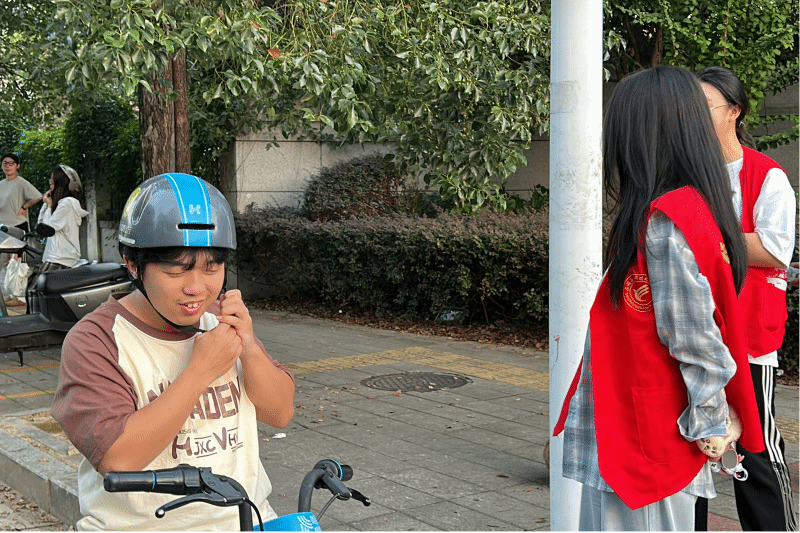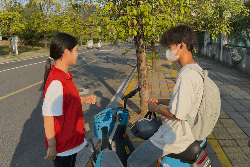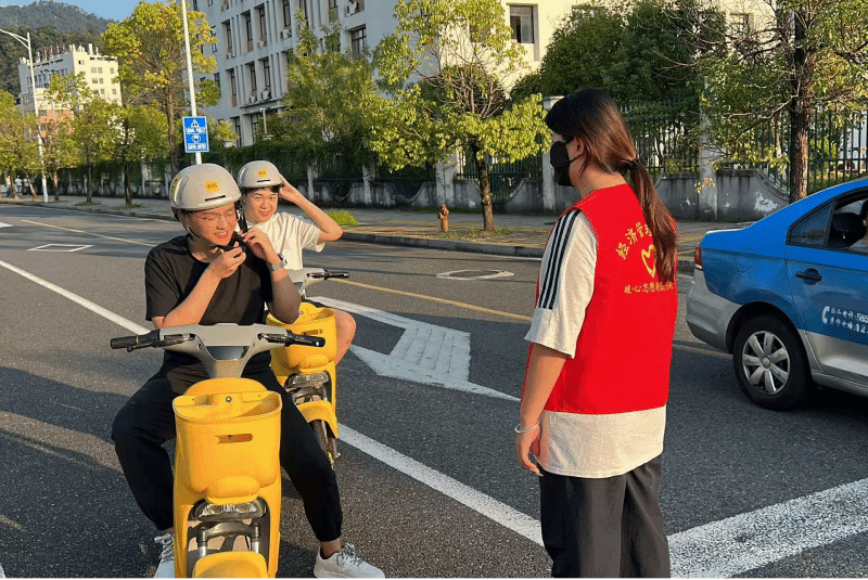 在校园主干道与出入口,志愿者们主动上前劝导未佩戴头盔的骑行者,耐心讲解并示范头盔的正确佩戴方式;同时提醒电动车骑行者做到不逆行、不闯红灯、不载人,确保行车安全;对于行人随意横穿马路等行为,志愿者们也及时进行了劝阻和引导,提醒大家遵守交通规则,增强自我保护意识。